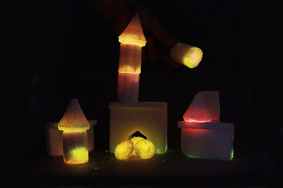 Exploring the mysterious characters of Radiant Crystals gives us the opportunity to investigate and experiment with future energy needs. The glowing sugar crystal bricks invite us to link back into utopian rocket trains, extraterrestrial journeys, skyscrapers. Whilst playfully being involved in this radiant materiality, we could imagine ourselves as martian engineers working on energy grids, transportation networks and information systems to come up with a new crystal palace for the human.