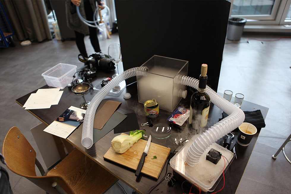 While diving into different scales, vapor becomes a coating agent on receptive micro-surface structures, a carrier for various flavors and nutritions in molecular kitchen, conditioning social bubbles, or affect air conditions in the workshop space itself. The gaseous material as a mediator has been built up imposing its own rules while being designed to study processes, that might happen with us all time.