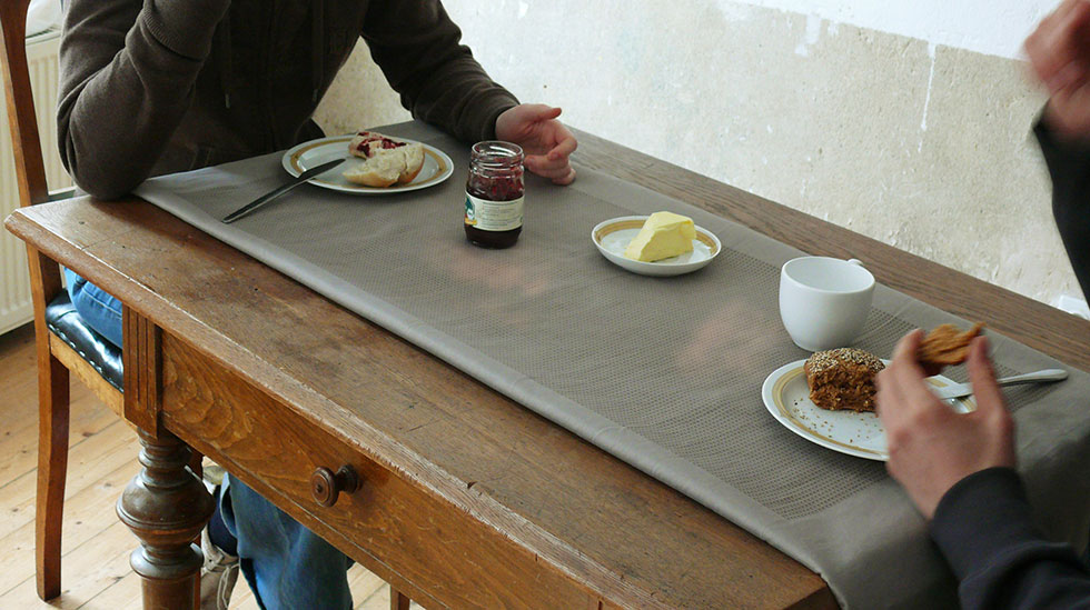These physical reactions result in a more visible interaction between man and material, revealing the intensity of human action and social interaction. The tablecloth becomes a materialized communication path - a mediator.