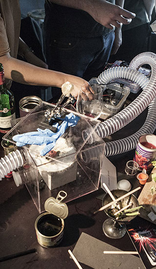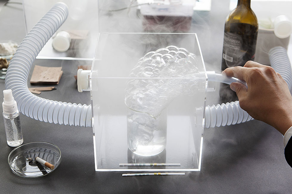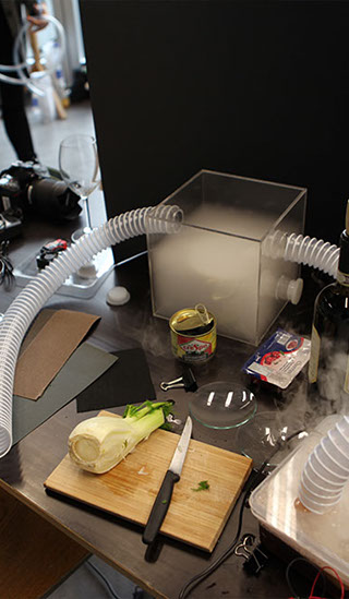 While diving into different scales, vapor becomes a coating agent on receptive micro-surface structures, a carrier for various flavors and nutritions in molecular kitchen, conditioning social bubbles, or affect air conditions in the workshop space itself. The gaseous material as a mediator has been built up imposing its own rules while being designed to study processes, that might happen with us all time.