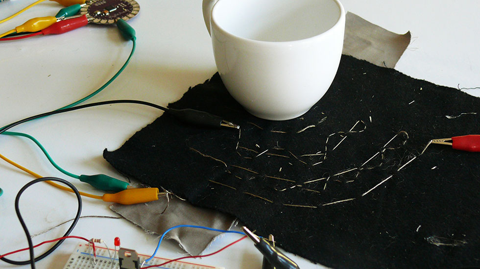 The "Interactive Tablecloth" captures traces of objects, like cups or hands on its surface through thermal reactive pigments screen printed on top. The surface reacts on 35°C with a color change, also triggered by heated resistant yarns and pressure sensors on the bottom layers of the tablecloth. A microcontroller can track the sensed inputs to play it back either linear or nonlinear over time.
