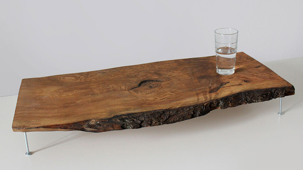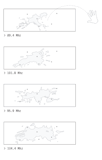 The Waterradio is a wooden board reacting to water by running different radio stations to listen to. The wood is extended through thin electrical wires in its annual rings, so that different spilled traces of liquids close different circuits to run a certain radio station. Further wiping connects other connecting points. Each composition of water droplets here represents a particular radio frequency until the water vanishes.