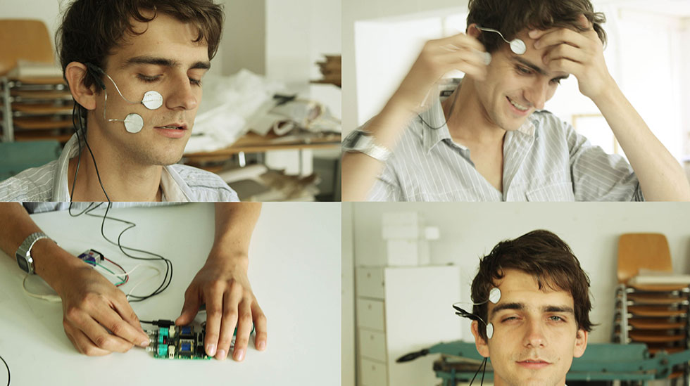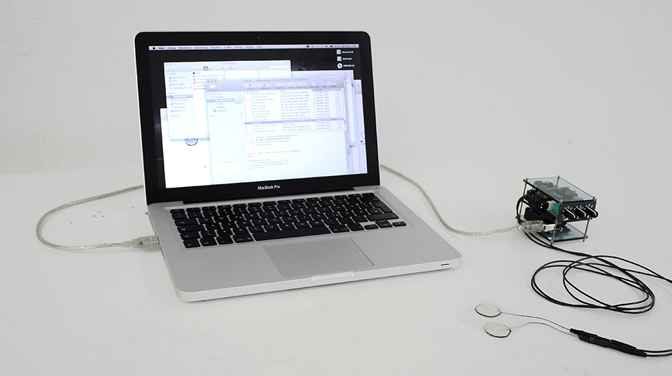In a second experiment, I have hacked a muscle stimulation device. My computer would give me a tickling feeling in my eyebrows, reminding me of being overstimulated, electrified and not well balanced when working too long on too many things at the same time. This body hacking was also inspired by investigations of the physician Duchenne de Boulogne 1862 and artists such as Daito Manabe or Stelarc, who created different facial expressions by electric shocks. It was a vague feeling tickling, prickly and strained.